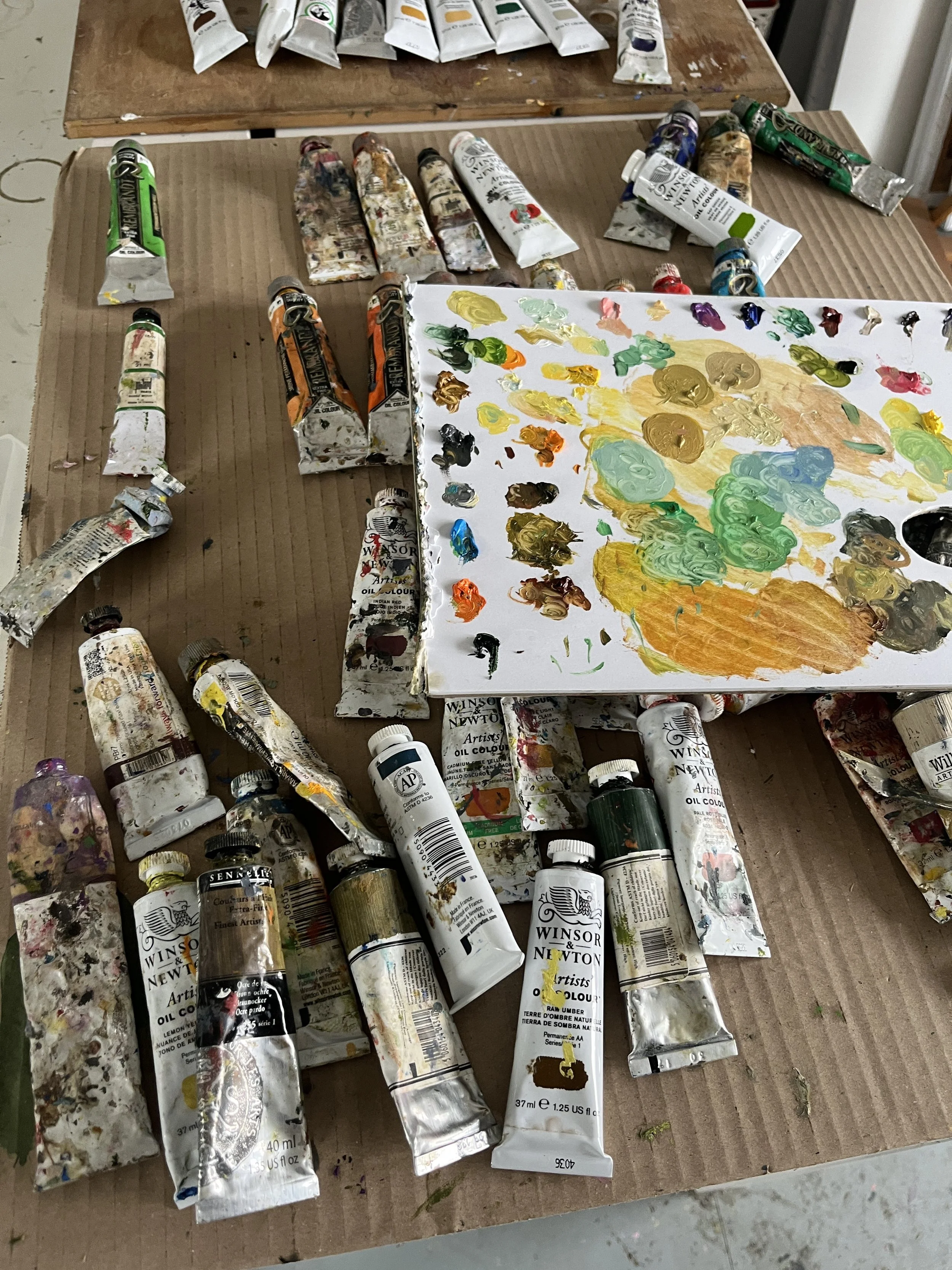 DF: (Picking up various tubes of paint) That’s £11, that’s £14, I use a lot of that; that’s £20 but it’ll probably last me the rest of my life as I don’t use a lot of red cadmium